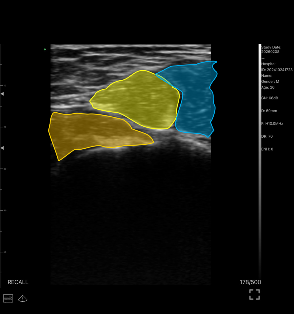 *黄色が上腕三頭筋、オレンジが小円筋、青が大円筋