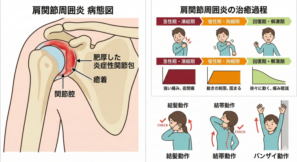 肩関節周囲炎とは、肩の関節をスムーズに動かすための組織(腱板や関節包など)に炎症が起き、**「痛み」と「動きの制限」**が出る状態を指します。